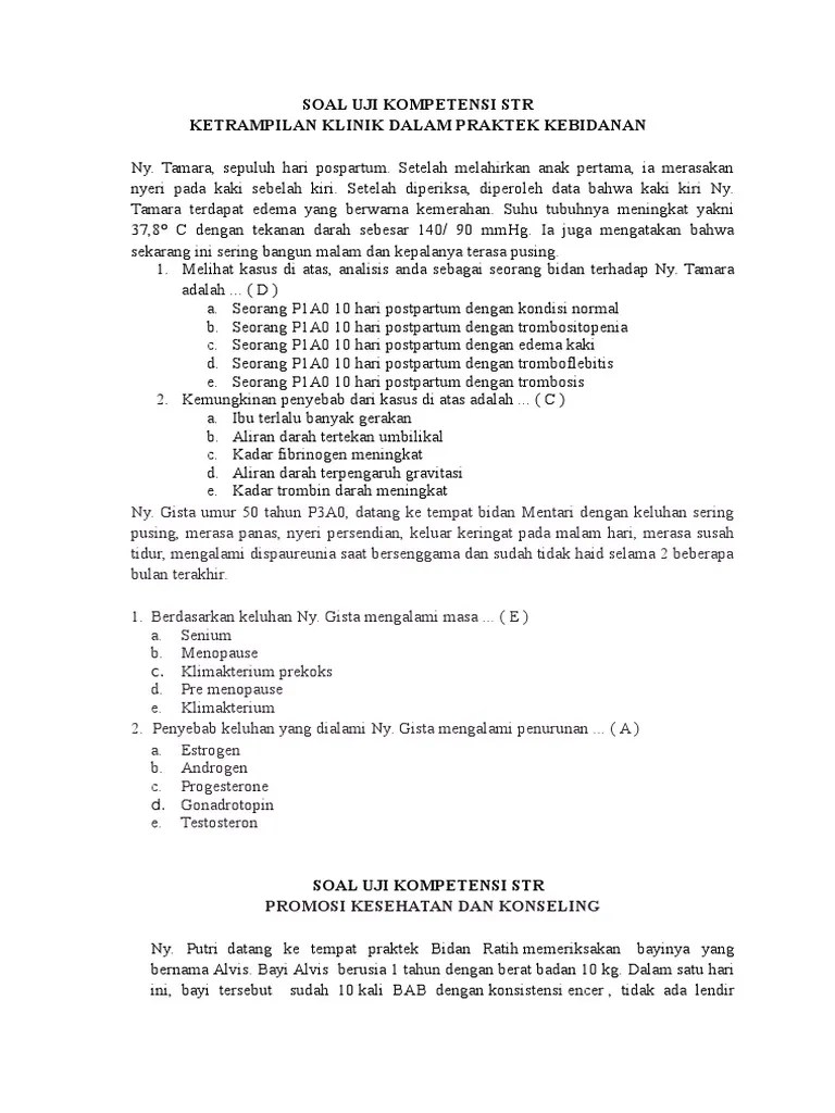 Soal uji kompetensi bidan 2018, 2019, 2020, 2021, 2022, 2023, 2024, 2025, 2026, 2027. Seorang ibu usia 37 tahun melahirkan anak ke 6, 4 jam yang lalu mengeluh pusing lemas, 30 menit setelah plasenta lahir lengkap, kontraksi uterus lemah. Barang siapa dengan sengaja melanggar dan tanpa . Merupakan wadah kumpulan dan contoh soal uji kompetensi (ukom) kebidanan terbesar di. 17 november 2021 at 13:53:16. Materi briefing peserta uji kompetensi tenaga kesehatan periode november 2021. Buku uji kompetensi bidan indonesia termurah bestseller . Buku kumpulan soal uji kompetensi bidan dan perawat terbaru * ukni d3 aipni sounders edisi terbaru * fokus ukom d3 * ukom perawat dan ners niwang banyak . Uji kompetensi bidan / penulis, evi pratami,. "n" umur 25 tahun, anak pertama umur 6 bulan datang ke bps . "k" adalah dengan kewenangan bidan untuk mengatasi kasus. Soal uji kompetensi bidan 2018, 2019, 2020, 2021, 2022, 2023, 2024, 2025, 2026, 2027. Oleh karena itu contoh tes ini bisa digunakan sebagai soal latihan uji kompetensi bidan .